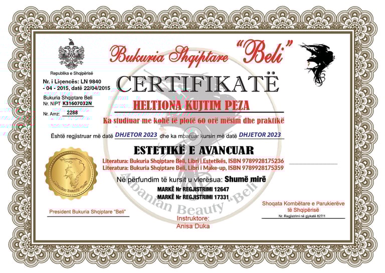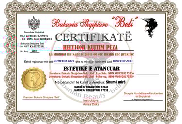 Çdo kurs është i dizajnuar për të ofruar një balancë të përsosur mes njohurive teorike dhe praktikës intensive, duke u fokusuar në aftësitë që kërkon tregu modern i estetikës. Në krye të këtyre programeve qëndron Dr. Anisa Duka, një eksperte me përvojë të gjatë dhe specializime të shumta në fushën e estetikës. Me qasje të përkushtuar ndaj edukimit, Dr. Anisa udhëheq çdo kurs me profesionalizëm dhe pasion, duke siguruar që çdo student të marrë njohuri të avancuara dhe aftësi të certifikuara, të njohura dhe të respektuara në Europa dhe Amerikë. Certifikatat që ofrohen pas përfundimit të kurseve nuk janë vetëm një dëshmi e njohurive të fituara, por edhe një çelës që hap dyert për karrierë ndërkombëtare dhe mundësi të panumërta profesionale.
